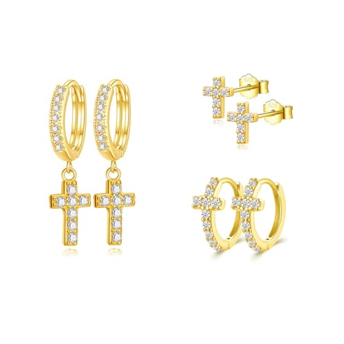 HinDaLi 3 par kors-örhängen silver 925 för kvinnor män flickor män guldörhängen damer små zirkonörhängen kreoler med korshänge brosk tragus sova allergivänliga, 10mm, Sterlingsilver, Kubisk zirkonia