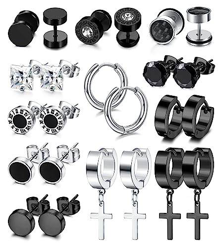 JeweBella 15 par örhängen herr rostfritt stål silver cirkel örhängen kors hängande örhängen brosk zirkon örhängen set punk örhänge svart/silver för män kvinnor, Rostfritt stål