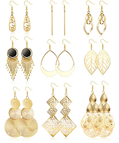 Guld örhängen Boho Set, 9 par guld droppörhängen för kvinnor flickor, allergivänliga modesmycken stora örhängen långa blad ihåliga lövverk Boho broskkrok örhängen drop örhängen