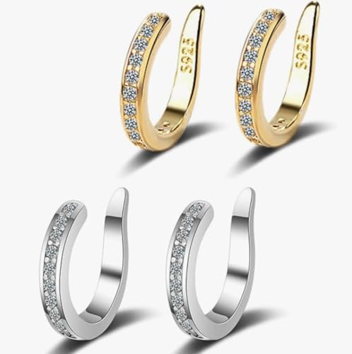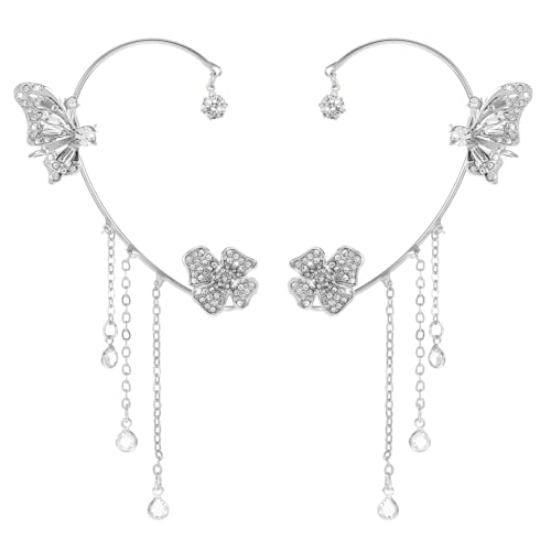 Mabor Fjäril Ear Cuff silver, 2 stycken clips örhängen öronsmycken örhängen utan öronhål med kedja ansluten diamantbelagd öronmanschett tofs gnistrande ingen piercing öronklämma för kvinnor