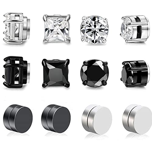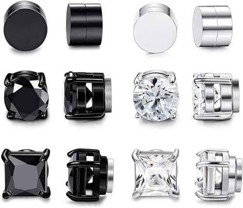 LIUJZZJ 6 par rostfritt stål magnet örhängen för män kvinnor flickor magnet stiftörhängen clips tunnel öronklämmor utan öronhål icke piercing örhängen set svart silverton, Rostfritt stål