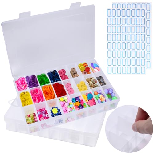 Fisynug 2 Förvaringslåda Plast Transparent 24 Fack Smådelslåda för Pärlor, Småsaker, örhängen, Ringar (Levereras med 128 Självhäftande Etiketter)