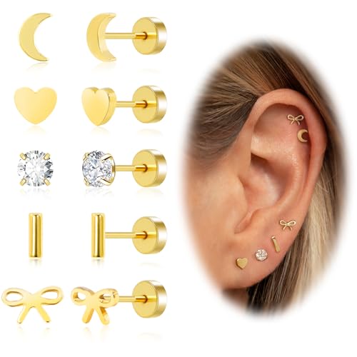 Jstyle Hypoallergeniska kirurgiska stålörhängen för känsliga öron 14K guld platt baksida örhängen för kvinnor män små örhängen i rostfritt stål flatback knoppring broskörhänge set för flera piercing,