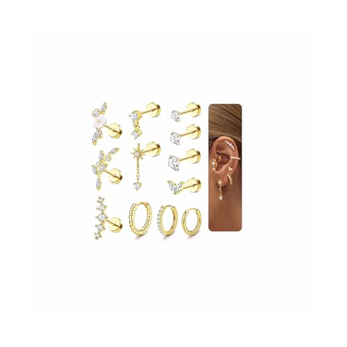Hypoallergeniska örhängen med platt rygg för kvinnor | 14K guldpläterade kirurgiska rostfritt stål ringörhängen broskörhänge set små platt baksida knoppörhängen stapel helix conch tragus piercing