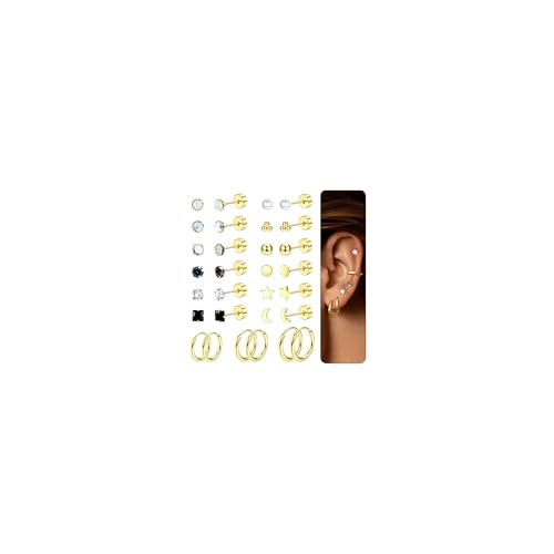 Diamday 12 par örhängen set för flera piercingar, små knoppörhängen, 14K guldpläterade örhängen i rostfritt stål, små guld platt baksida örhängen för kvinnor broskring örhängen, Metall Rostfritt stål