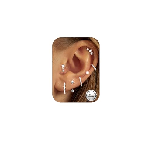 AVYRING 7 par silver guldring örhängen för kvinnor flickor, allergivänligt kirurgiskt stål platt baksida konstnärligt helix-örhängen set med 3 mm färgade CZ, huggie hoop örhängen 10 mm, 12 mm, 14 mm,