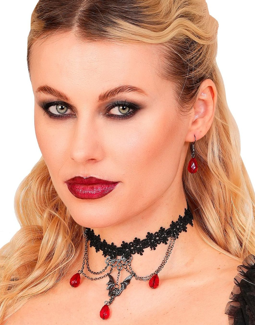 Gotiskt Set Med Örhängen Och Choker Med Fladdermus Och Röda Stenar