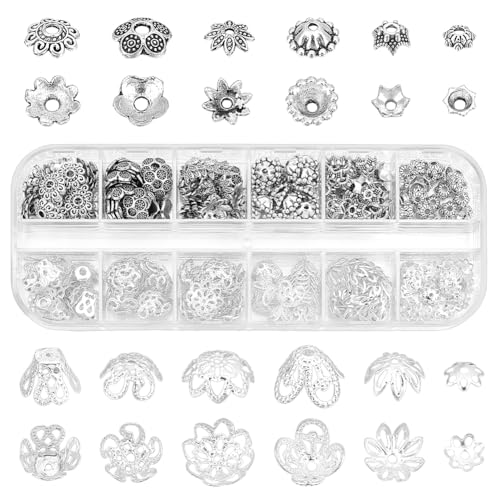PH PandaHall 261 st blompärlor lock metall distanser pärlor kepsar, ihåliga blommor pärla ändlock solid pärla keps fästen för armband halsband örhängen smyckestillverkning, antik silver och silver