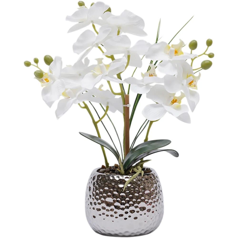 Konstgjord orkidé - Konstväxt i kruka - Bonsai-stil bordsmodell - 36×39 cm - Kruka 13×10 cm - Tyg/sten/keramik - Vit