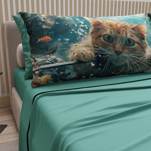 PETTI Artigiani Italiani - Djur med kattlakan i bomull med örngott i digitalt tryck, lakan för mellanstor säng, set för mellanstor säng, 100% tillverkad i Italien