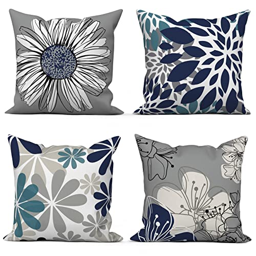 ASDCXZ Blå örngott 40 x 40 cm, set om 4, norra Europa moderna blommor blå grå soffa dekorativa kuddar örngott tvättbar polyester linne textil stoppning örngott