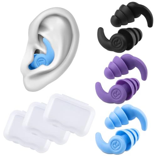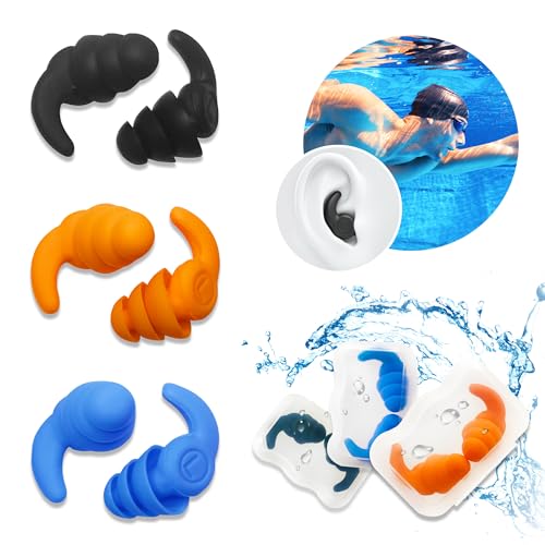 3 par Simning öronproppar vuxna, vattentäta återanvändbara mjuka Silikon Swim Ear Plugs, förvaringsbox, för att sova,studera,surfing,dusch,snorkling, simning och andra vattensporter(Svart Orange Blå)