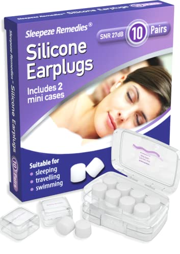 Sleepeze Remedies 10 genomskinliga vita par återanvändbara öronproppar i silikon, 2 mini resefodral för daglig användning, brusreducerande 27 dB, öronproppar för sömn, resor, formbara, vattentäta, 20 x öronproppar