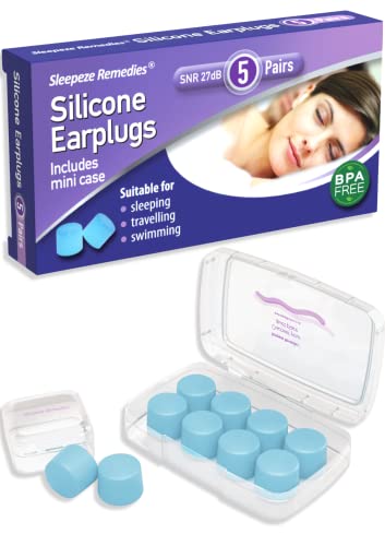 Sleepeze Remedies 5 par öronproppar i silikon för sömn (blå), 10 x återanvändbara öronproppar, miniresefodral för daglig användning, brusreducerande 27 dB, öronproppar för sömn, simning, formbar, vattentät
