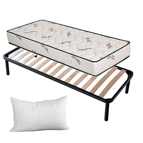 EvergreenWeb Sängset med ribbotten + madrass, 90 x 190 cm + minneskudde gratis, ortopedisk, hårdhet H2/H3 med Aloe Vera-överdrag med massageeffekt, förstärkt sängram, 4 avtagbara fötter