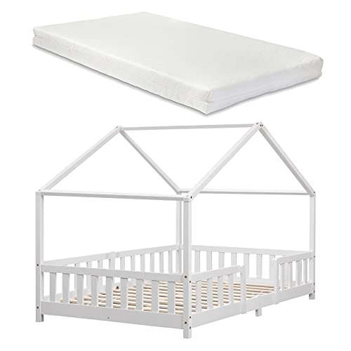 Juniorsäng Treviolo hussäng inkl. ortopedisk madrass med sängskydd 140x70cm furu vit [en.casa]