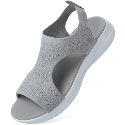 VTASQ sommar tvättbar Slingback ortopedisk rutschkana sportsandaler damer bekväma ortopediska sandaler för ventilerande sport stickade sandaler, mesh mjuk sula casual damskor, GRÅ, 38 EU