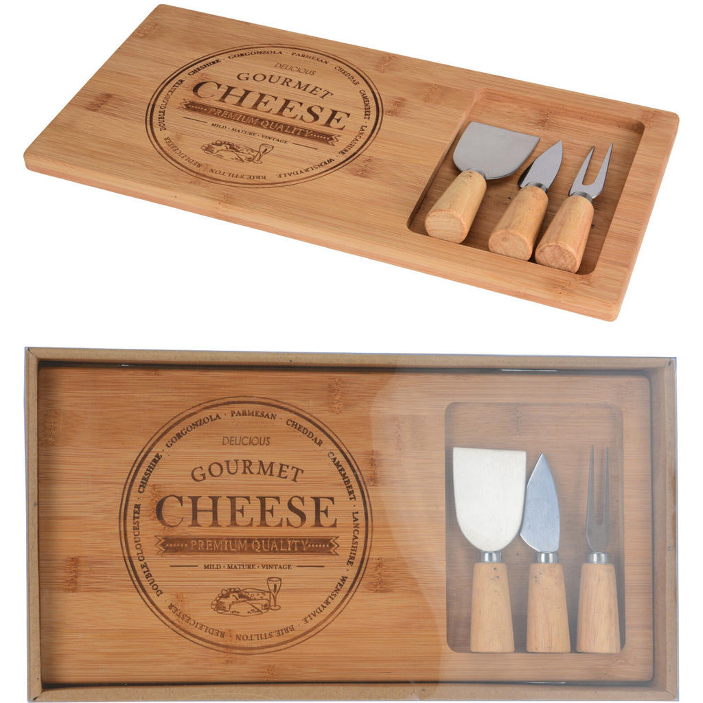 Relaxdays Ostbräda med ostknivset, HD 4 x 25 cm, vridbar ostplatta, 4 delar. Ostbestick, bambu och rostfritt stål, natur
