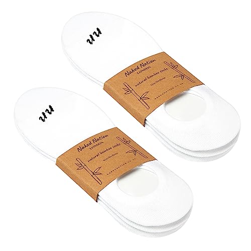 Naked Nation No Show bambustrumpor - halkfri design utan silikon, 6 par, supermjuka och andningsbara, osynliga träningsstrumpor för kvinnor och män, storlek 4-7 (M) / 8-11 (L), Vitt, L