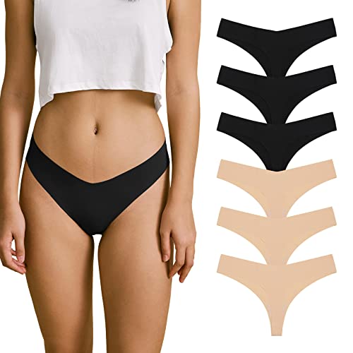 SHARICCA Sömlös sträng för kvinnor, osynliga tangas, underkläder, kvinnor, med låg midja, V-midja, andas, ingen show stringkalsonger, set, (6-pack) 3 svart 3 beige, L