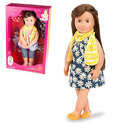 Vår generation – Posable 18-tums docka – Lifelike Brown Eyes & Long Brown Hair – Carry-on Bagage & Resetillbehör – Pretend Play – Leksaker för barn åldrar 3 & Up – Reese