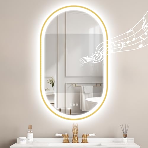 STARLEAD Guld spegel badrum oval med ljus och Bluetooth 100 x 60 cm, LED-badrumsspegel med anti-dimma, justerbar, 3 färger ljus, minne, IP44, härdat glas, horisontell/vertikal, icke-metallisk ram