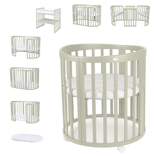 Waldin Oval spjälsäng 7in1 - Spjälsäng med madrass, hjul - Spjälsängar med skötbord - Växande spjälsäng - Babysäng - Bäddsoffa i trä