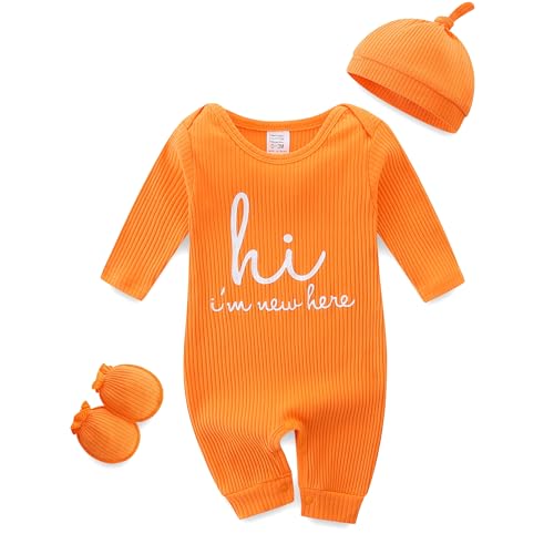 KIDDLETOWN Unisex nyfödd onesie ribbad sparkdräkt baby växer overall hatt och handskar, baby pojke flicka kläder långärmad sparkdräkt 0-3 månader, 3 st kläder set flicka långärmad sparkdräkt