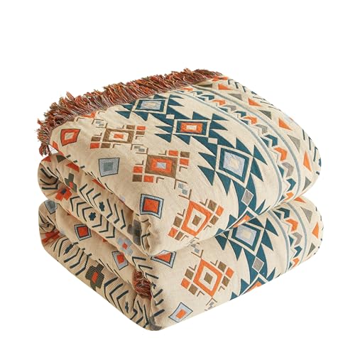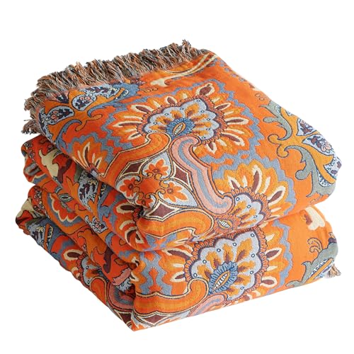 SESoftexly Bohemisk filt i 100 % bomull, dubbelsidigt muslin, stort överkast, 200 x 230 cm, filt för soffa och säng, estetisk design, perfekt för vardagsrum och sovrum, orange/grön