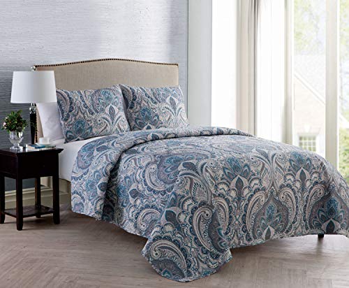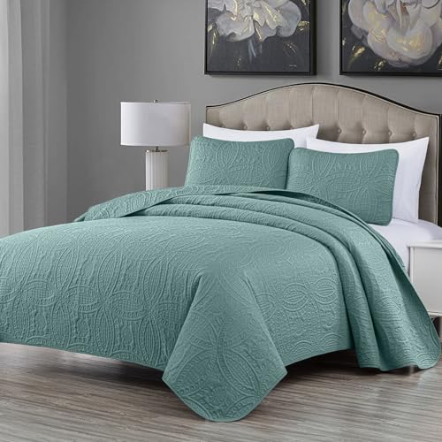 Dreams & Drapes teal blått överkast (200 x 230 cm) – turkos-damast sängöverdrag – vitt och blågröna blått täcke – blommig vadderad filt i blågrön – traditionellt/vintage överkast i blågrön blå