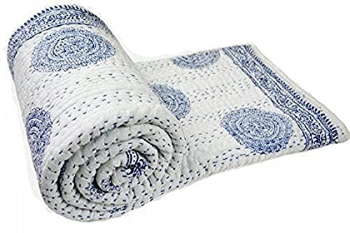 Vit kung/tvilling handgjord bohemisk handblock tryck ren bomull överkast kantha söm hippie kantha säng spridning vändbart sängöverkast överkast överkast (vit och blå, 228 x 258 cm)