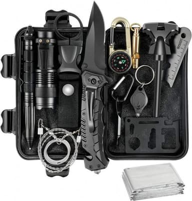 Tradista Överlevnadskit 15-i-1 – överlevnadskit för nödsituationer utomhus med kniv/taktisk ficklampa för camping / bushcraft / vandring / jakt / utomhusäventyr, svart
