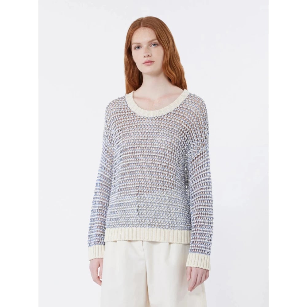 Weekend Max Mara, Stickade Tröjor , Dam, M, Bomull, Oversize-tröja i linne- och bomullsgarn med nätstickning och see-through-effekt samt båtringning