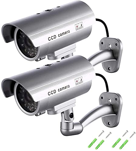 Maxesla Falsk säkerhetskamera med lysande LED 2-pack bullet Dummy Fake Surveillance CCTV decoy realistiskt utseende övervakningssystem inomhus utomhus vattentät varningsklistermärke