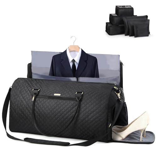 Lekeinchi 2 i 1 klädpåse resväska dam, stor vikbar resväska weekender med 6 packkuber & skofack, flygplan sportväska reseväska, handbagage, väska för helger, resor, gymsvart