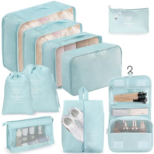 Resväskearrangör, packkuber, resväskorganiseringsset 10 delar, bagageorganisatör vattentät, packkuber, med packpåsar, klädväskor, kosmetikväska, skoväska, arrangör resväska (Blå)
