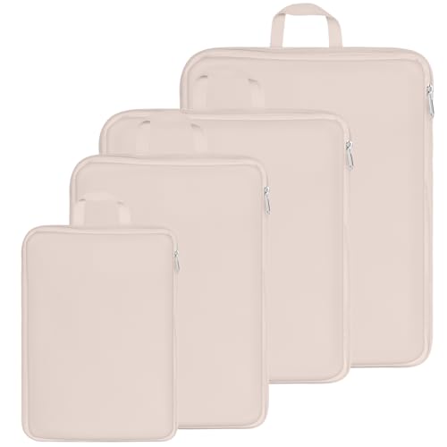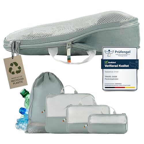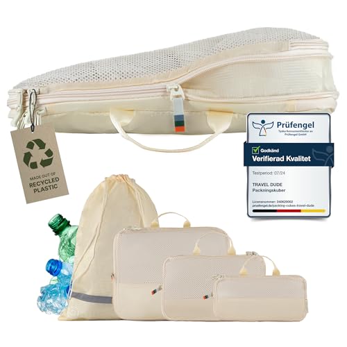 TRAVEL DUDE Packkuber set med kompression tillverkade av återvunna plastflaskor | lätta packkuber | packväska för ryggsäck och resväska | Sand Beige, 4 stycken