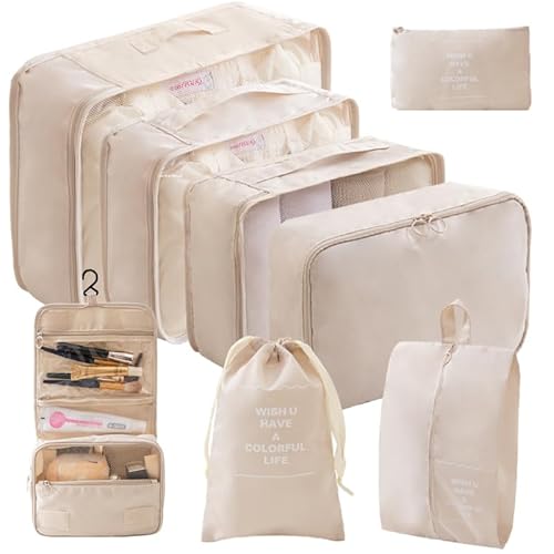 Packing Cubes Resväska arrangör set 8 delar – vattentäta packkuber och klädväskor – researrangör för resväskor med kosmetikväska, skopåse och kabelväska (beige)