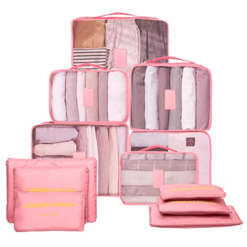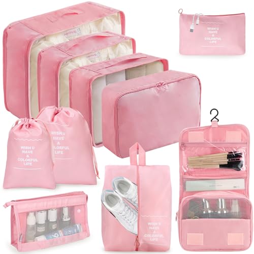 Resväskearrangör, packkuber, resväskorganiseringsset 10 delar, bagageorganisatör vattentät, packkuber, med packpåsar, klädväskor, kosmetikväska, skoväska, arrangör resväska (Rosa)