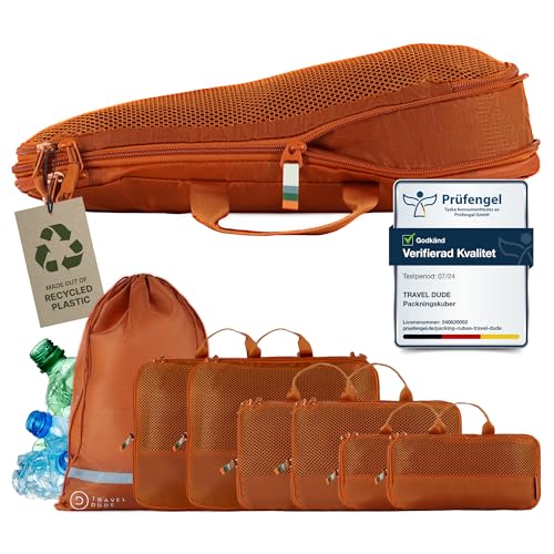 TRAVEL DUDE Packkuber set med kompression tillverkade av återvunna plastflaskor | lätta packkuber | packväska för ryggsäck och resväska | Bränd orange, 7 stycken