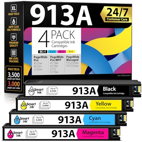 Smart Ink kompatibla bläckpatroner kompatibel med HP 913A 913 A 4 multipack (svart, blå, röd, gul) kompatibel med PageWide Pro 477dw 577dw 452dw 477dn 452dn 577z 552dw P55250dw skrivare