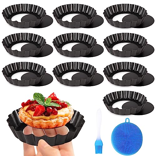 Frasheng 10 stycken tarteformar med lyft, non-stick belagd tarteform, 10 cm (4 tum), tartlettformar, mini tarteform, rund pajform, tartelettformar av kolstål, svart