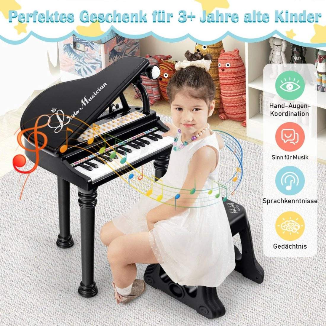 Leksakspiano med 31 tangenter för barn med pall – Svart, bärbart roligt