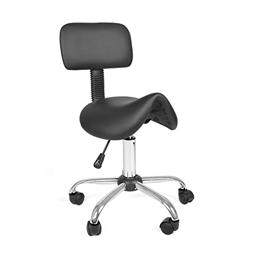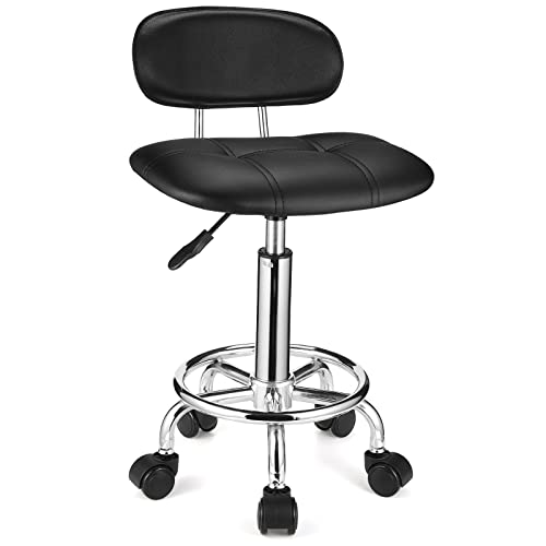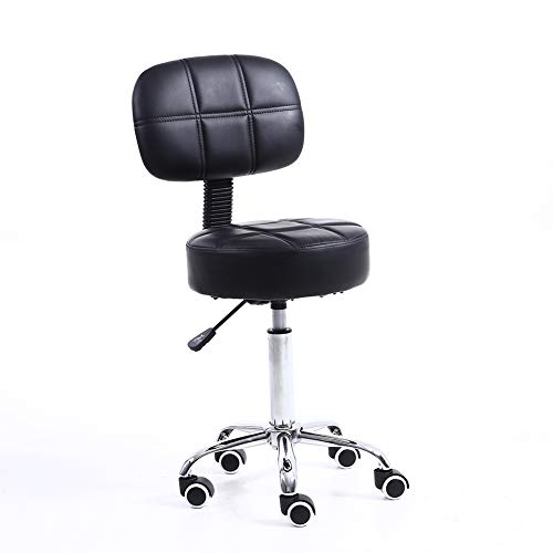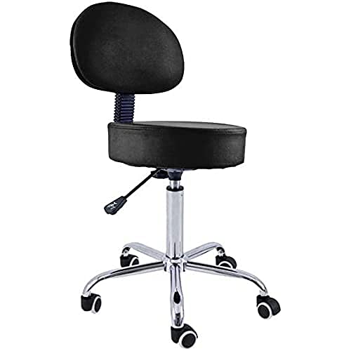 BAKAJI Pall med hjul och ryggstöd, svängbar arbetsstol med ryggstöd, 10 cm Faux Läder och stålbas, justerbar höjd, för kosmetolog, kontor, arbete (Svart)