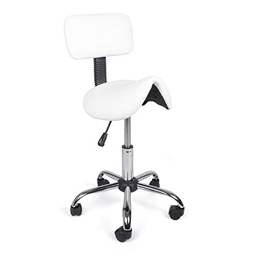 Mingone Sadelpall med ryggstöd, vit, kontorspall med hjul, ergonomisk roterande pall arbetsstol, kosmetika, sadelstol, 360° pall justerbar höjd 75–86 cm