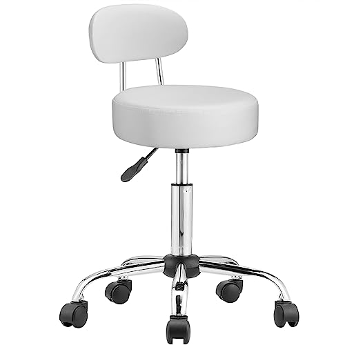BAKAJI Pall med hjul och ryggstöd, svängbar arbetsstol med ryggstöd, 10 cm Faux Läder och stålbas, justerbar höjd, för kosmetolog, kontor, arbete (vit)