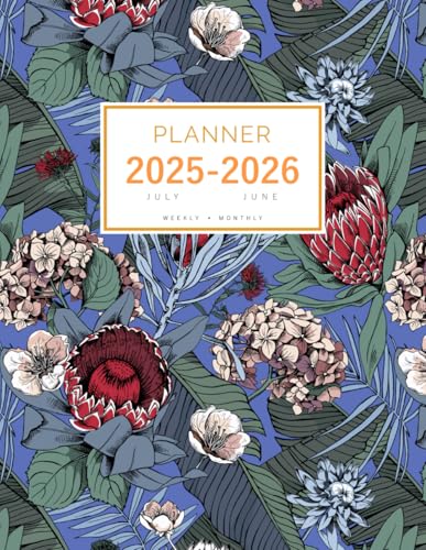 Planner July 2025-2026 June: 8.5 x 11 Weekly and Monthly Organizer | Protea Hydrangea and Palm Leaf Design Blue