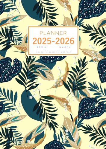 Planner April 2025-2026 March: A4 Large Notebook Organizer with Hourly Time Slots | Tropical Palm Leaf Design Yellow