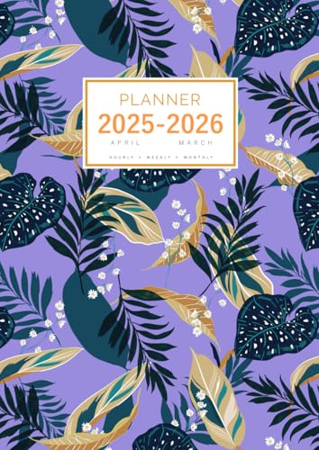 Planner April 2025-2026 March: A4 Large Notebook Organizer with Hourly Time Slots | Tropical Palm Leaf Design Blue-Violet