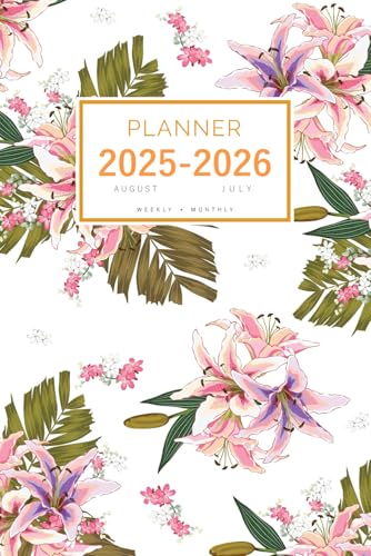 Planner August 2025-2026 July: 6x9 Weekly and Monthly Organizer | Lilly Wildflower Palm Leaf Design White